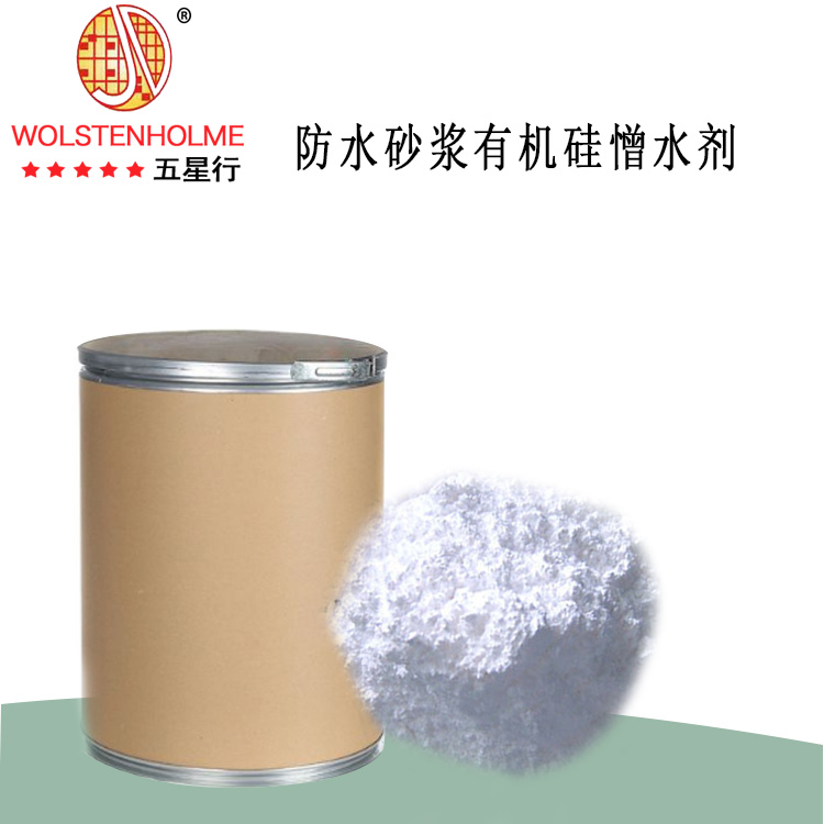 五星行硅烷型憎水剂该产品是采用易溶于水的保护胶体和抗结块剂通过喷雾干燥将硅烷包裹后获得的粉末状硅烷基产品。当砂浆加水拌合后,该产品的保护胶体外壳迅速溶解于水并释放出包裹的硅烷使其再分散到拌合水中。在水泥水化后的高碱性环境下,硅烷中亲水的有机官能团水解形成高反应活性的硅烷醇基团,硅烷醇基团继续同水泥水化产物中的羟基基团进行不可逆反应形成化学结合,从而使通过交连作用连接在一起的硅烷牢固地固定在水泥砂浆中孔壁的表面。由于憎水的有机官能团朝向孔壁的外侧,使得孔隙的表面获得了憎水性,由此为砂浆带来了整体的憎水效果